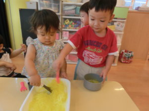 幼児組の感触遊びではでは感じたことを言葉にする中で表現力を膨らませることが出来ます。