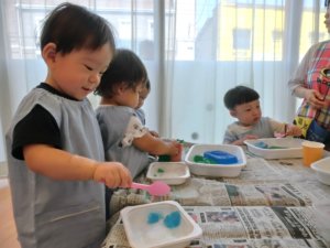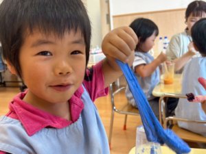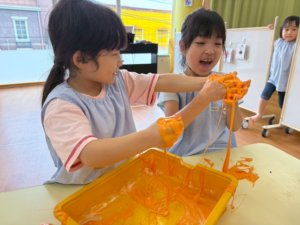 人とのかかわりもより濃くなり、遊びの発展もより進んでいきます。気づきや発見も多いようで「この色とこの色を混ぜるとこんな色になるんだ!」「スライムの固さが変わった!」など様々な気づきを友だちと共有し、楽しんでいましたよ ^^
