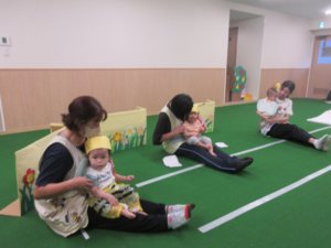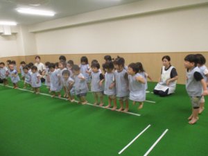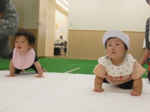 今週末に開催される運動会の練習を頑張っている子どもたち。始まりのディズニー体操は毎日、行っている体操なので、子どもたちもお手の物。大きくジャンプしたり、手足をぶらぶらさせて、身体をほぐします。やる気モードが高まった後は、みんなが大好きなかけっこ。まだ歩行ができない0歳児はマットの上をハイハイで進みます。