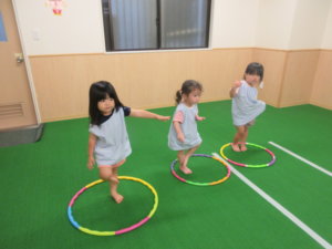 フラミンゴのように一本足でバランスを取ったり、ウサギに成り切って、フープの中をピョンピョンジャンプで進みます。他にもアルマジロやナマケモノになる場面もあります。最後の体操(エクササイズ)では、曲中に出てくる動物に合わせる子どもたち。動きがとてもキュートです。