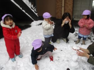 雪の冷たさに慣れてくると、あちらこちらで雪だまづくりがスタート。「一緒に大きい雪だるまをつくろう!」と、みんなで協力して作る子もいれば、一人で黙々と大作を作る子もいました。いつの間にか全員が雪だるまづくりに夢中になり、たくさんの雪だるまが完成!雪の感触を楽しみながら、大はしゃぎの子どもたちでした。