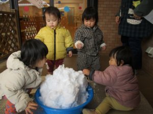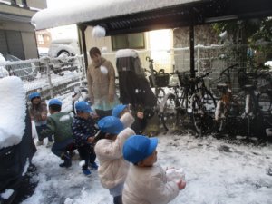 雪が積もった日の朝。防寒服を着て、長靴を履いて雪遊びをする気満々の出で立ちで登園してきた子どもたち。みんなで園の裏で雪遊びをしました。雪を見るなり、躊躇なく雪を掴んで丸める子、雪に触れることをためらう子など反応はさまざまでした。