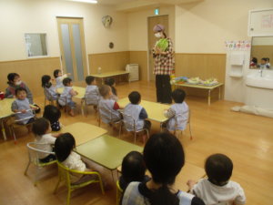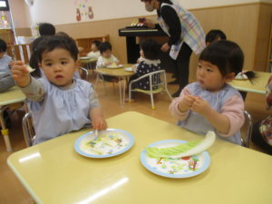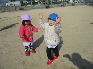 天気の良い日は、公園に行って遊びます。最近のブームは「しっぽ取り」。初めに逃げるチームがスタート。ズボンにくっ付けた、しっぽ(ハンカチ)を取られまいと全力で逃げます。追いかけるチームは何が何でもしっぽを取るぞ!と息巻いて必死で追いかけます。しっぽを取られると悔しくて涙が出てしまうこともありますが、勝ち負けを通して、感情の折り合いを学んでいます。