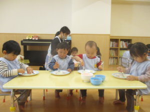 白菜が入ったボウルに小さく切ったカブ、人参を加えてクッキング終了。全員がきちんと説明を聞き、最後まで取り組む姿を見て成長を感じました。給食で提供されたスープの味は格別だったようで、子どもたちも笑顔で食べ進めていました。クッキングのみならず、同じ活動を繰り返すことで、「次はこうなる」という見通す力や、自立心や自信が育まれます。今年度も残り1カ月となりましたが、日々のルーティンを大事にし、子どもたちが自分のペースでたくましく成長できるように過ごしていきたいと思います。