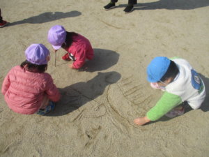 2つの踏み切りと横断歩道を渡って…と、ちょっとした冒険気分を味わいながらたどり着く広い公園。みんなでしゃぼん玉を追いかけて走ったり、地面に目いっぱいお絵かきができるので、子どもたちも気に入ってます。戸外活動を通して、季節の風や温度などを感じ、自然と触れ合うことで好奇心や感受性を育んでいきたいと思います。