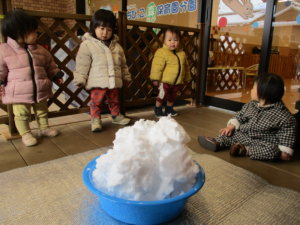0歳児の前に雪が入ったタライを置くと「これはなんだ?」と言わんばかりの表情で見つめ、なかなか近づこうとしません。スタッフが雪を手に乗せると、ジリジリと雪が入ったタライに近づき、自ら雪を触り始めます。雪をギュッと握ったり、雪の上を歩いたりして、0歳児なりに雪遊びを楽しんでいました。