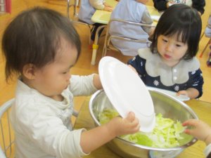 最後は0、1歳児のクッキングの様子をお伝えします。毎月、旬の食材を使って行うクッキング。今回は「カブと白菜と人参の冬野菜スープ」を作りました。まずは、白菜を手でちぎります。芯の部分は硬く、子どもたちの力でちぎるのは至難の業。白菜の向きを変えたり、持ち方を変えたりと試行錯誤していました。