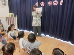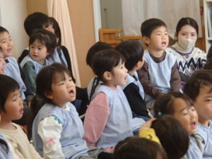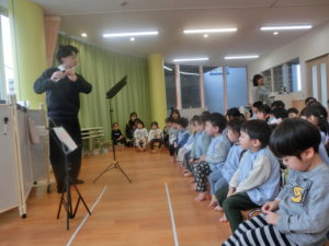 先日は音楽教室があり、フルートを使って子どもたちが馴染みのある曲を演奏してくれました。フルートの音が思っていたより高い音だったようで、鳴らした瞬間「高い音!」と驚いていた子ども達。長いフルートも「片づける時は3つに分かれて小さくなるんだよ」と豆知識も教えてもらい楽器についてより深く知ることが出来ました。演奏曲は子どもたちの好きな「さんぽ」の曲から始まり、ひな祭りの時期に合わせた「うれしいひなまつり」の曲では一緒に歌って教室を楽しんだ子どもたちです。年齢問わず、乳児組さんも興味津々でしたよ♪普段本物の楽器の生音に触れる機会が中々ないかと思いますので、貴重な体験が出来ました。