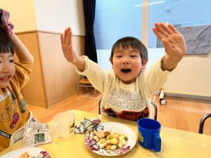 また3月3日にはひなまつり会があり、乳児組では「ひなまつり」の意味を説明し、お内裏様とお雛様にあられをあげるゲームをしました。「お腹がすいてるみたいだから助けてあげて~」と話すと嬉しそうに「どうぞ!」と言いながら食べさせていた子どもたちです。楽しみながら行事に親しむことが出来ました^^