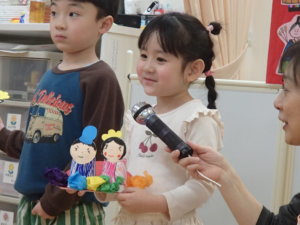 幼児組では雛飾りついての説明を丁寧にしてもらった子どもたち。音楽教室でひな祭りのことに触れていたこともあってか「これ知ってる!」という声が飛び交っていたようです^^その後は歌を歌ったり、みんなが作った雛飾りの作品をクラスごとに発表しました。前に出てもらい、「こういう所を頑張ったよ」、「ここをこだわって作ったよ」と思い思いに教えてくれました。その日のおやつではカルピスとひなあられも食べ、いつもより特別な日となりました。