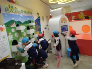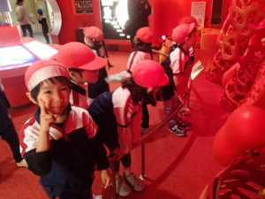 健康科学館に着くといつかいちのお友達と合流。一緒に「からだの作りについて」と「健康について」を楽しみながら学ぶことが出来ました。その中でも「バイキンをやっつける」ゲームが1番人気でした。プロジェクターをつかったゲームで登場したバイキンを踏みつけて何匹やっつけれるか?という内容だったのですが、いつかいちの友だちと「つぎ変わってー!」、「一緒にこれしよう!」といいながら遊んでいました。